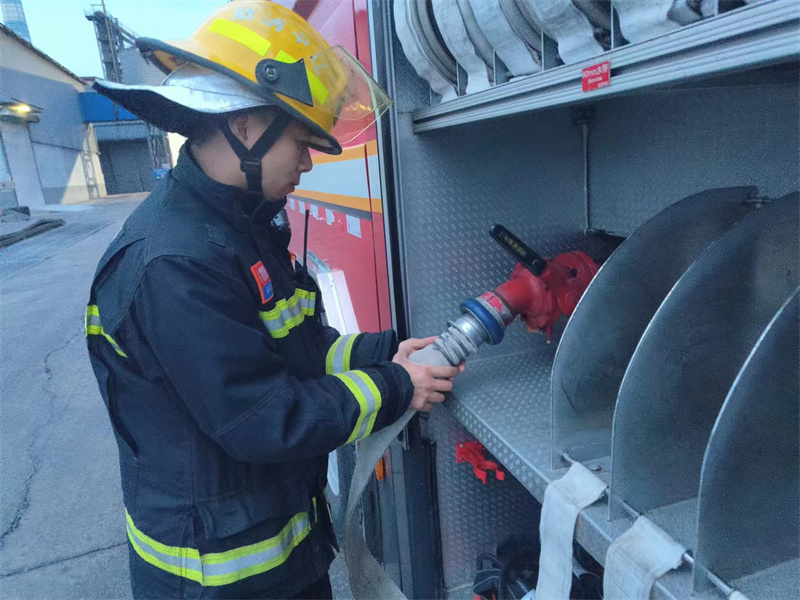 熟悉过后,指挥员下达演练指令,模拟车间二楼突发火灾,有1人被困,根据单位实际,指挥员现场研究部署进攻路线、停车位置、力量部署、处置对策等,全体参演人员有计划、有步骤、有组织地展开实地演练,整个演练环节层层推进、衔接紧密,消防救援人员动作娴熟,配合默契,演练现场有条不紊、紧张有序。