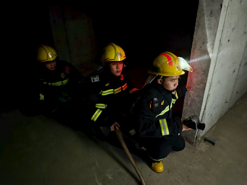 训练中,模拟多层居民楼电路老化起火,火焰形成立体燃烧,墙体开裂。指战员携装备到场处置时,模拟墙体坍塌,指挥员立即下令避险,队伍依托掩体防护并有序撤离至安全区。随后的浓烟疏散训练中,指战员在能见度不足 1 米环境下,借手电辨路、靠安全绳保持队形,协同转移 “被困人员” 至地面。随后,指挥员进行点评,肯定队伍实战素养,指出协同短板,要求针对性强化以提升应急与避险能力。