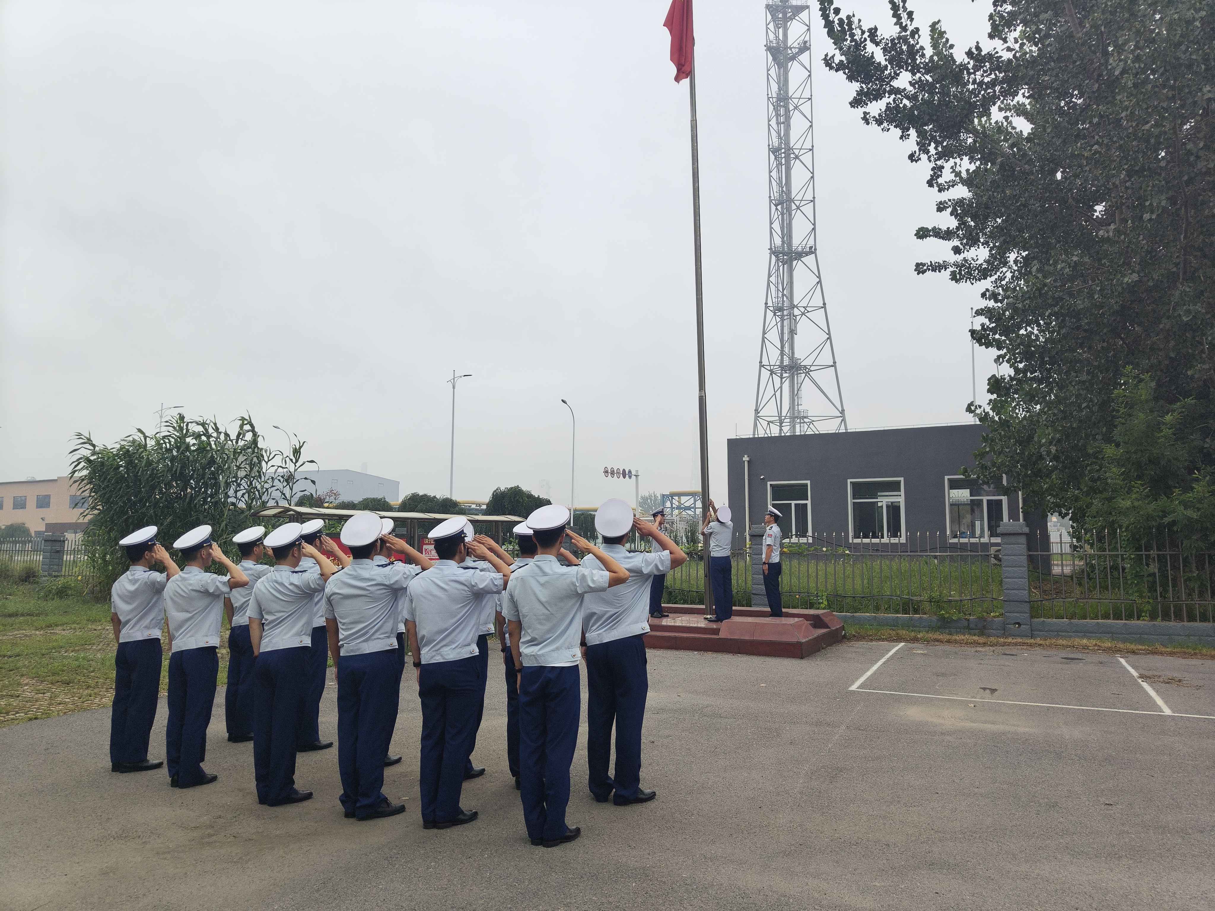 护旗队员迈着整齐划一、铿锵有力的步伐,护送五星红旗走向升旗台。随着雄壮激昂的《义勇军进行曲》奏响,鲜艳的五星红旗缓缓升起,全体人员昂首肃立、神情肃穆,面向国旗庄严敬礼,嘹亮的国歌声回荡在营区上空。
