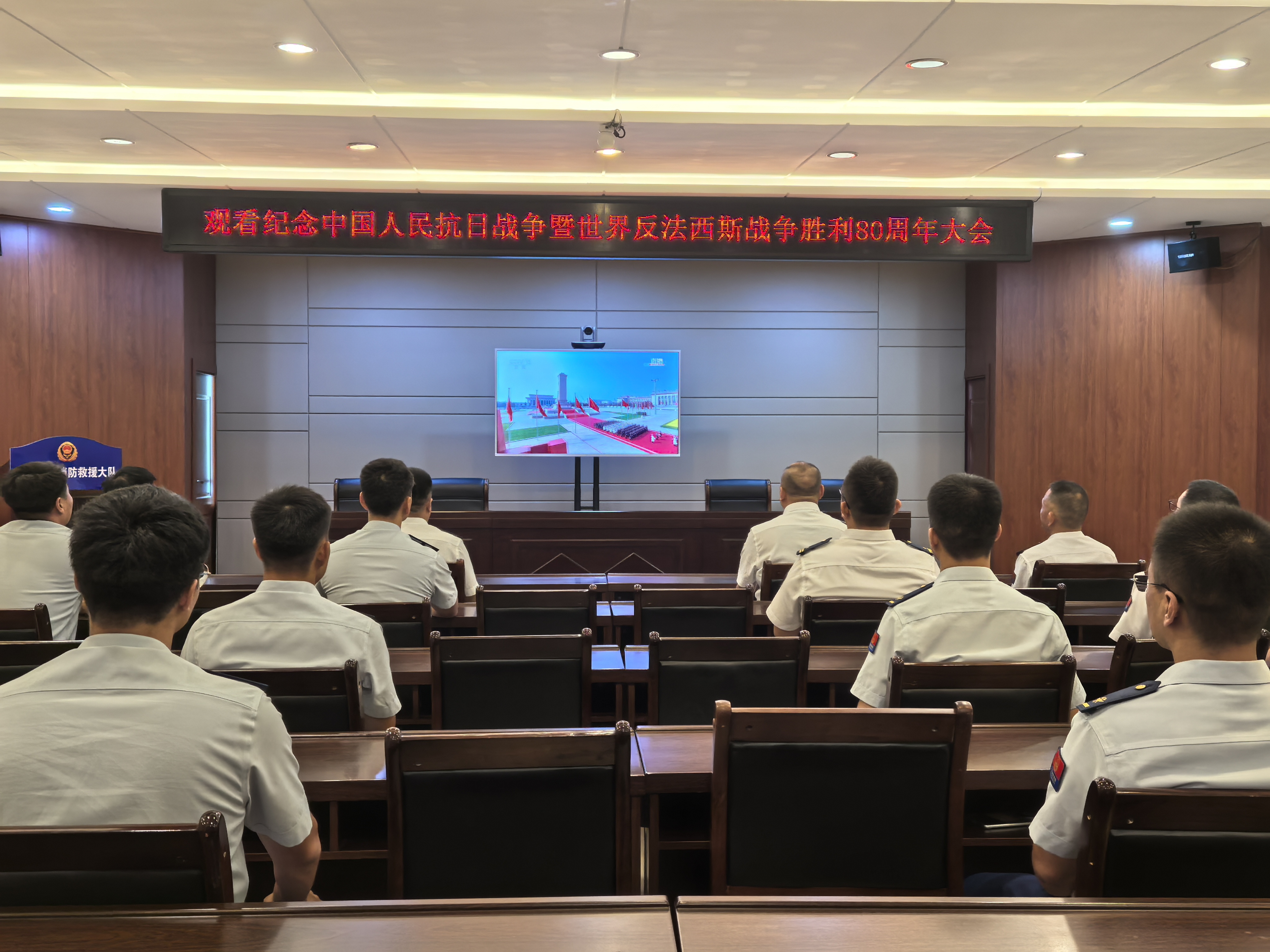 兴隆台区消防救援大队组织集中收看纪念中国人民抗日战争暨世界反法西斯战争胜利80周年大会盛况