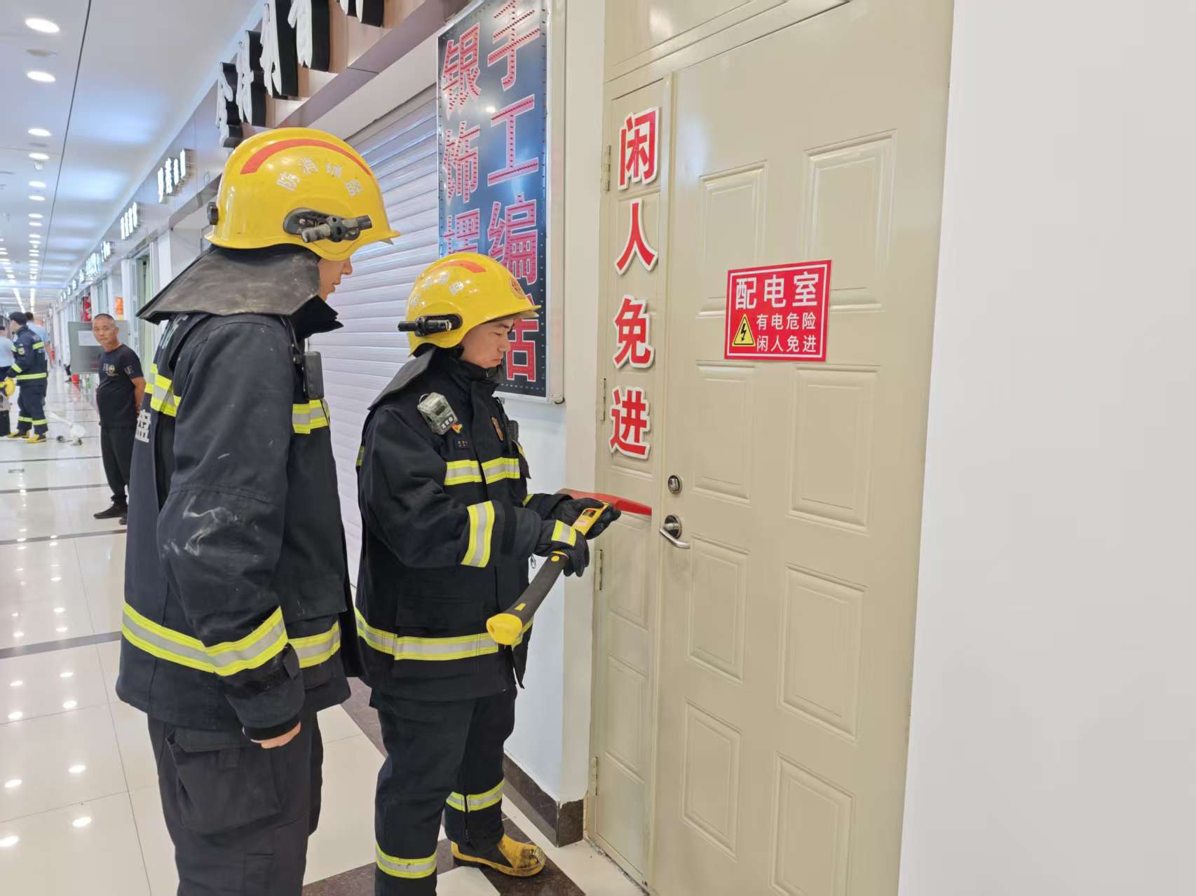 训练中,全体消防救援人员精神高度集中,严格遵循操作规范,模拟了鹤吉购物广场多类典型险情。当模拟 2 层服装商铺因电路短路起火,浓烟快速蔓延至 3 层时,侦查警戒组立即使用热成像仪定位火源,通过有毒气体检测仪监测烟雾中一氧化碳、氰化物浓度,同步在商场外围 50 米范围设置警戒区;灭火攻坚组佩戴正压式空气呼吸器,沿北侧疏散楼梯抵达起火层,利用室内消火栓连接水带干线压制火势。训练全程,队站干部紧盯细节,及时纠正 “疏散引导时未使用扩音设备导致指令传达不清晰”“灭火组水带连接时未避开客流通道” 等问题,现场示范规范操作,持续优化处置流程。