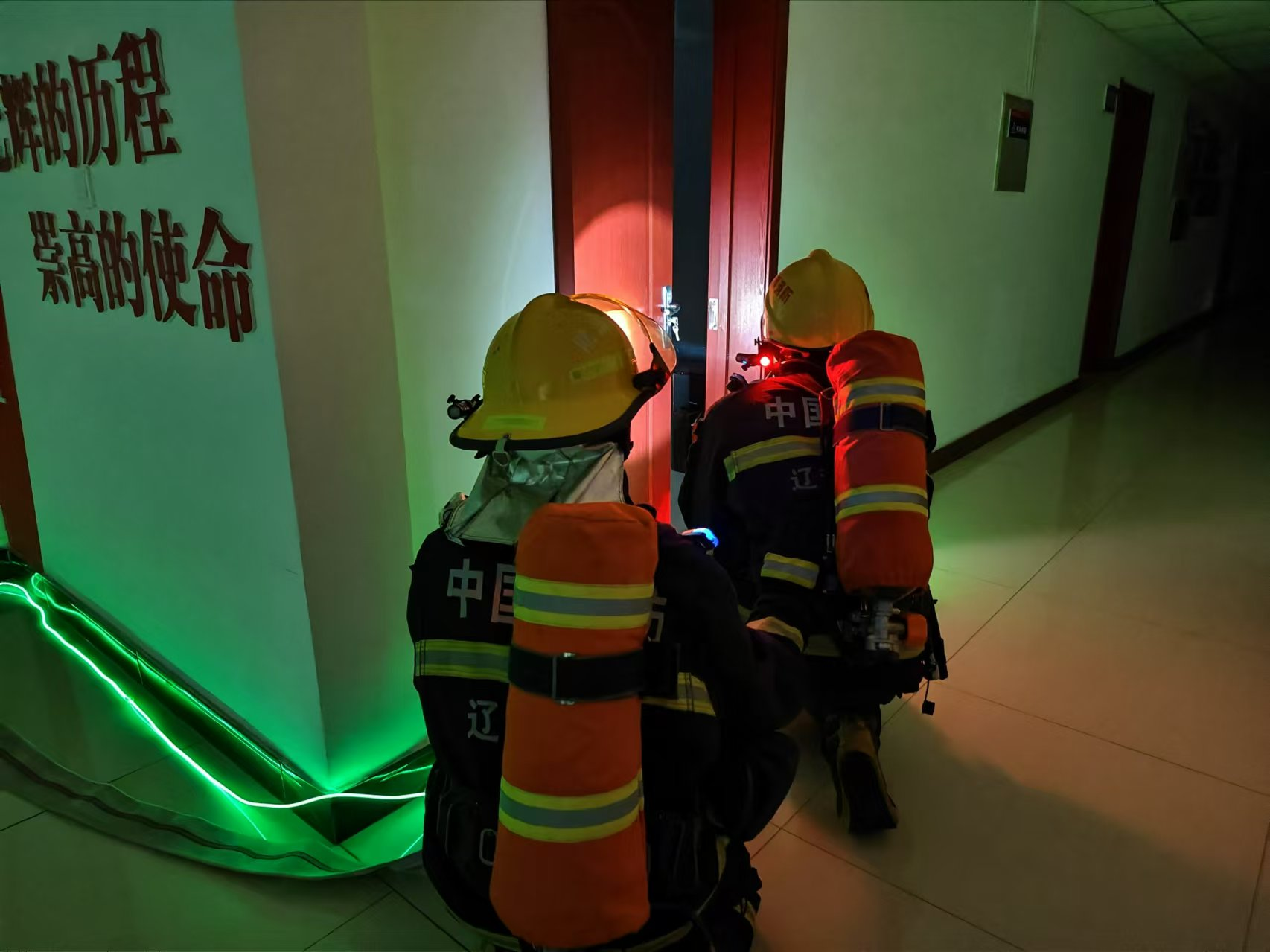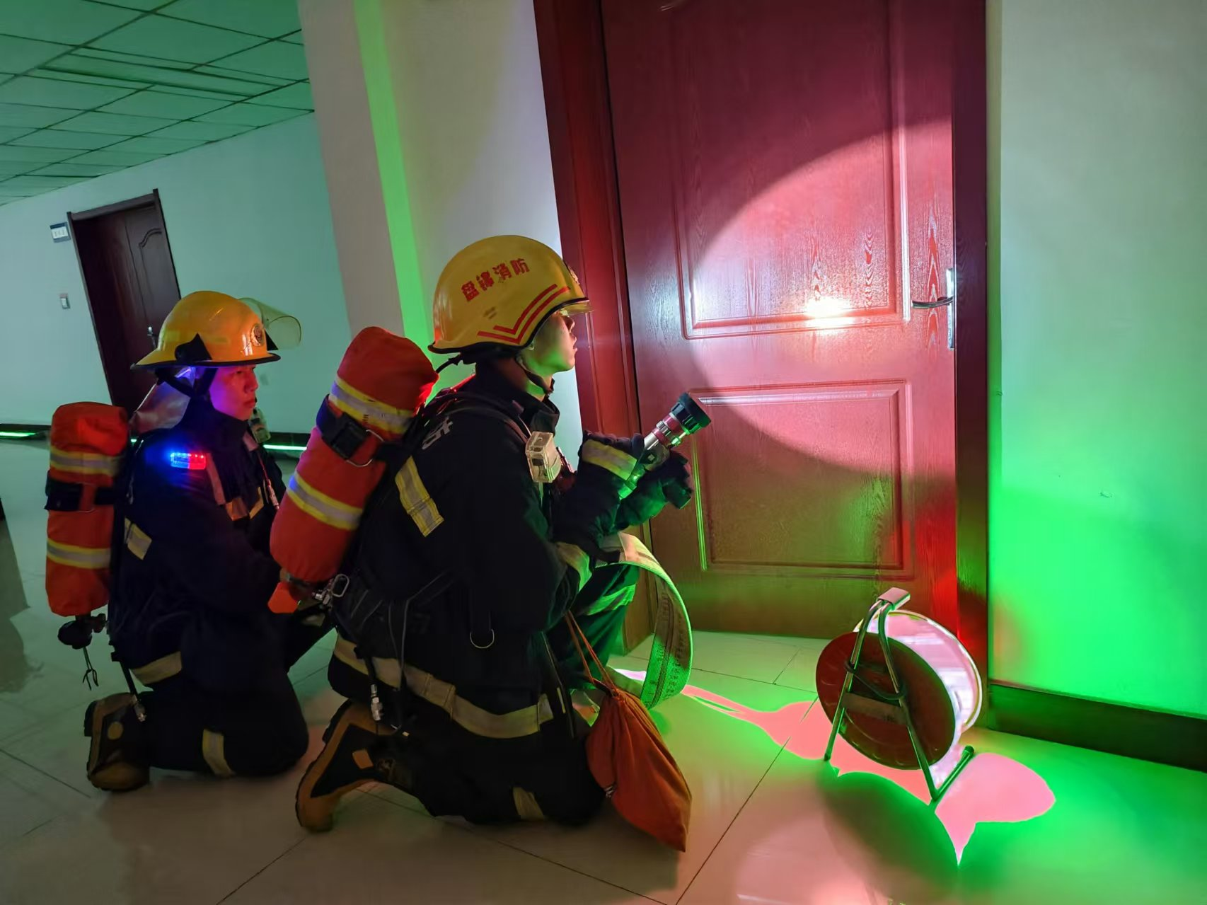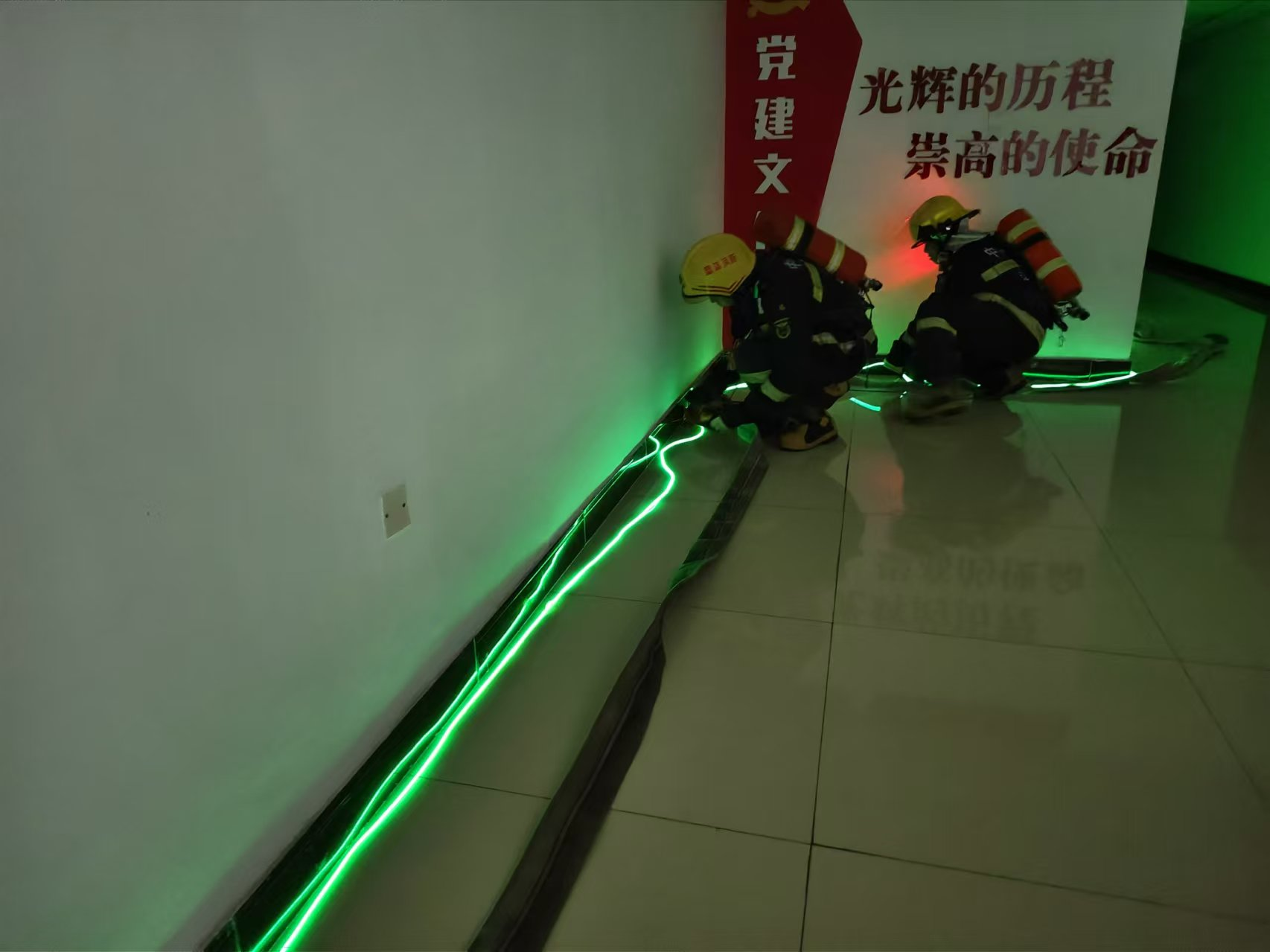 训练结合夜间救援等高频场景,在营区内模拟无光源黑暗场景,全方位检验救生照明线使用效果,确保训练场景与实战需求高度契合,同时模拟火情,要求队员在铺设救生照明线的同时,同步完成水带连接与铺设。训练中,队员围绕救生照明线关键环节展开;线路铺设时,针对黑暗狭窄场景采用“低姿推进”方式,在岔路处额外增设照明标识,避免线路混乱。