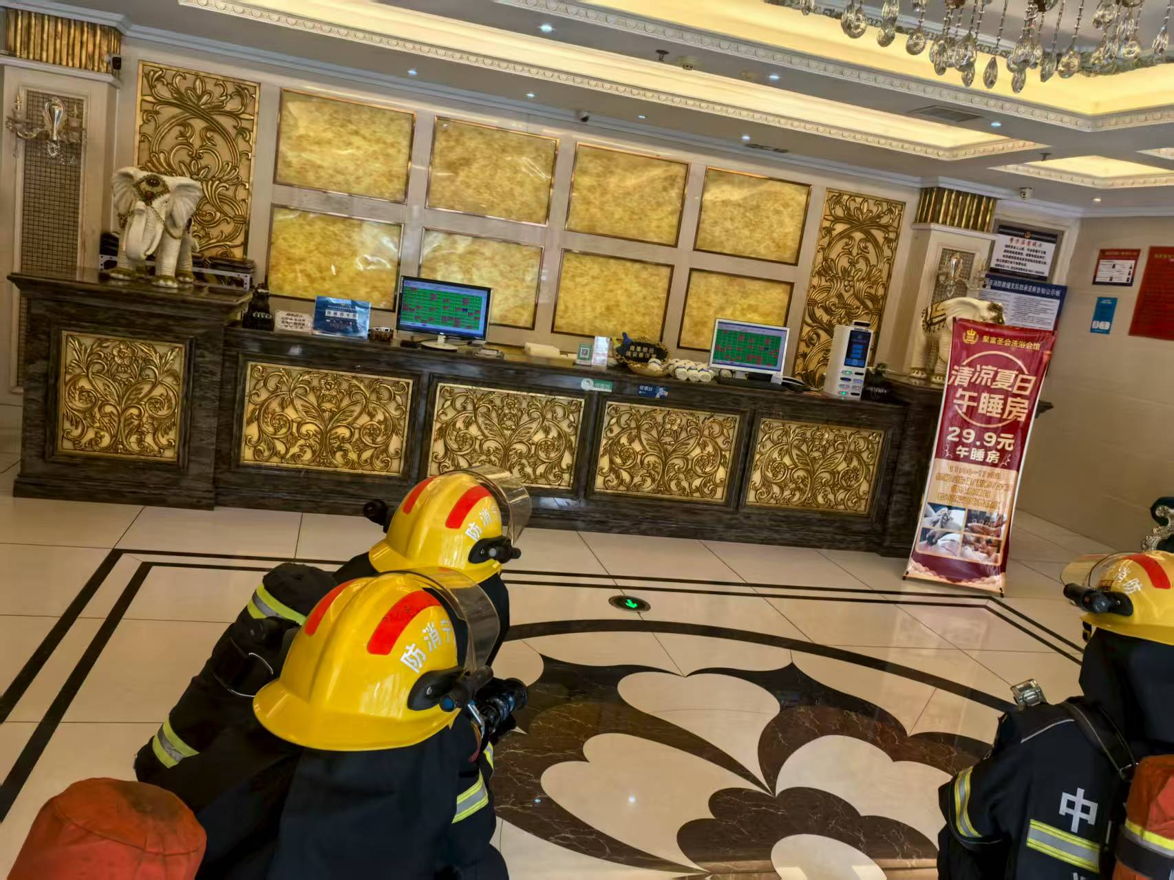 训练前,消防救援人员对一楼前台区域进行细致勘察,重点掌握前台接待区、入口通道、应急出口位置,以及前台内电脑、票据柜等可燃物分布情况,同时明确前台与更衣室、淋浴区的连通路线,结合“前台电气故障引发初期火情、人员拥堵被困”的模拟场景,制定包含警戒管控、火情侦察、人员疏散、灭火处置的专项训练方案,细化各组任务分工。