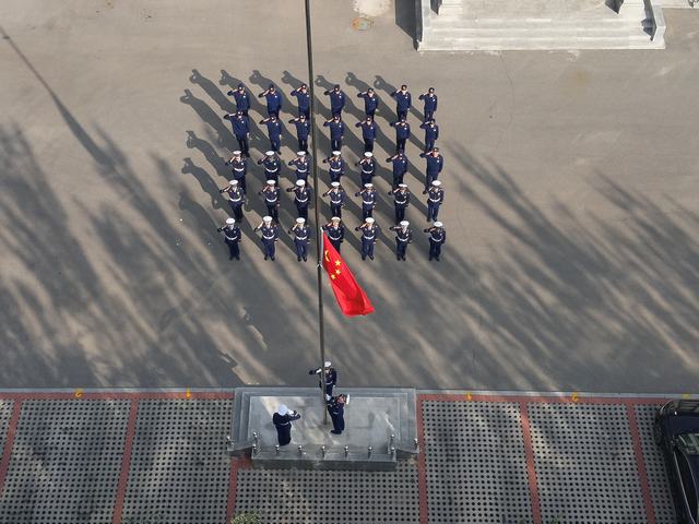 上午8时40分,双台子区消防救援大队全体指战员整齐列队,面向国旗庄严肃立。一双双坚毅的目光注视着鲜红的国旗,一颗颗炽热的心脏在这一刻与祖国紧紧连在了一起。四名国旗护卫队员迈着矫健的步伐将国旗护送至升旗台,在高奏的《中华人民共和国国歌》声中,五星红旗冉冉升起,全体指战员向国旗敬礼。鲜艳的五星红旗迎风招展,映红了每名指战员的脸庞。