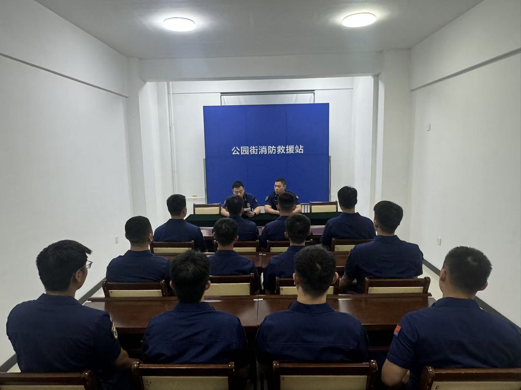 推演前,消防站设定高层住宅小区15层住户因电器老化引发火灾,火势突破窗口向上下楼层蔓延,部分居民因浓烟封堵逃生通道被困”的典型场景,并将推演流程拆解为“接警调度、途中研判、现场侦查、力量部署、战术实施、应急保障”六个关键环节,明确各岗位人员需重点思考的决策要点。