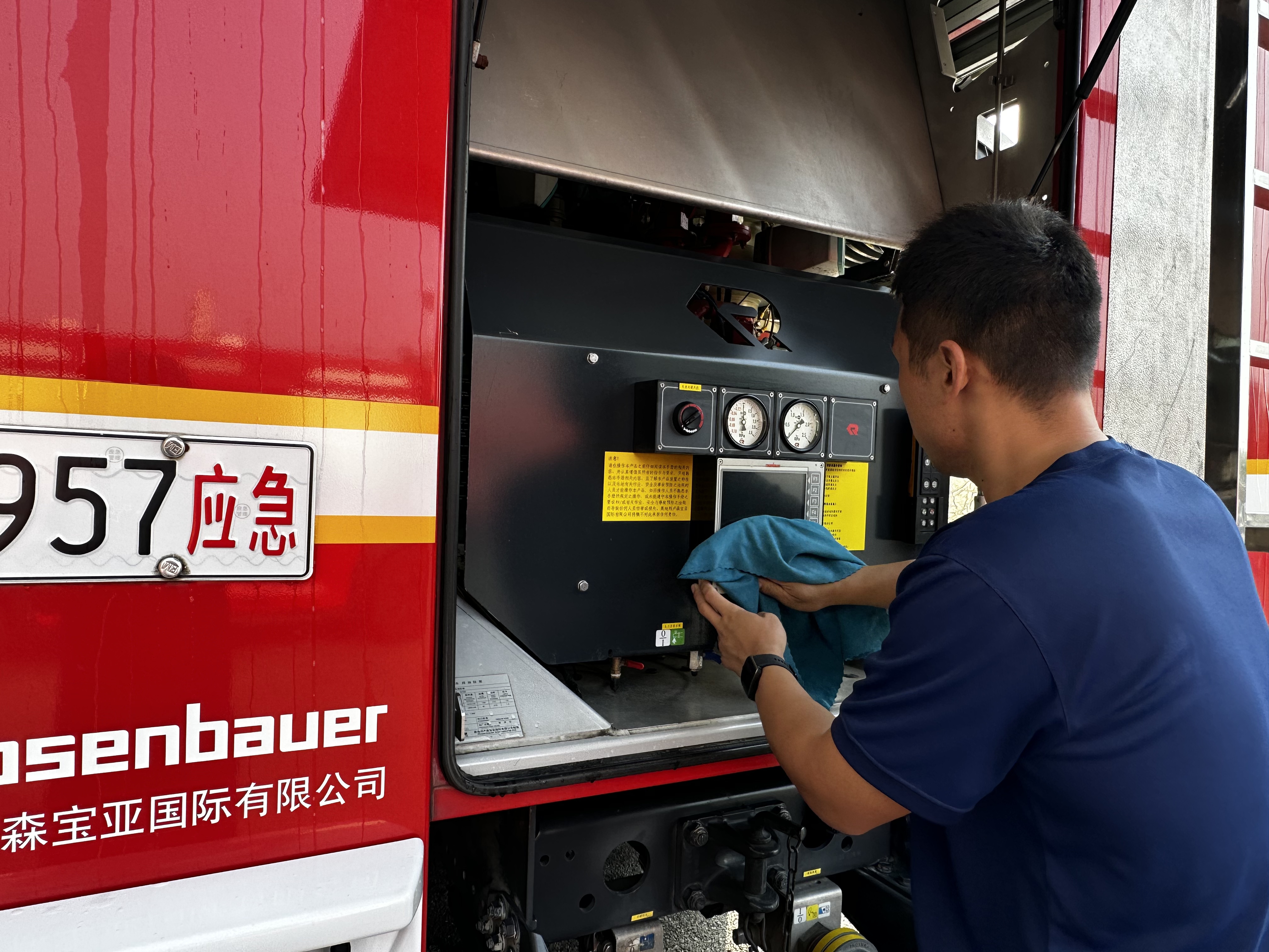 全体指战员开展全要素清理维护,所有器材下车按照“逐车过、逐项查”原则,对消防车器材箱、液压系统、车载水泵等关键部位进行擦拭保养,使用高压水枪冲洗车身积垢,用清洁剂擦拭驾驶室仪表盘、各类器材装备,对水带接口进行密封性测试并晾晒干燥。战斗员同步对破拆工具、呼吸器等器材进行功能测试,更换磨损严重的密封圈和滤芯。实现装备管理“底数清、情况明、状态好”。