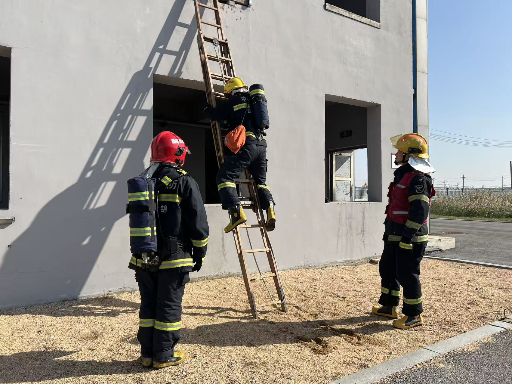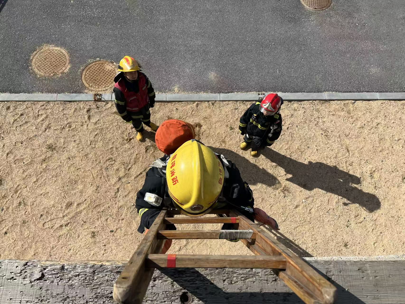 实操环节,队员分组协作开展沿拉梯撤离训练:一组快速架设拉梯并检查稳固性,二组按规范完成撤离操作,其余队员负责现场警戒。训练同步融入群众引导等环节,实现自身安全保障与群众救助的高效衔接。过程紧张有序,充分达成预设训练目标。