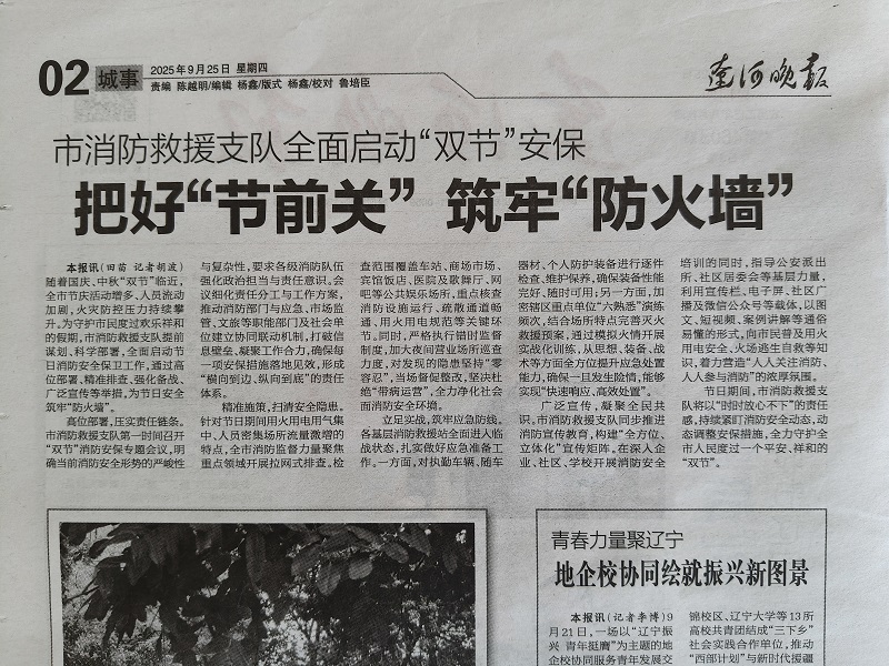 下一篇:“2025.09.25”-- 辽河晚报(新媒体)--发布 把好“节前关”,筑牢“防火墙”!市消防救援支队全面启动“双节”安保